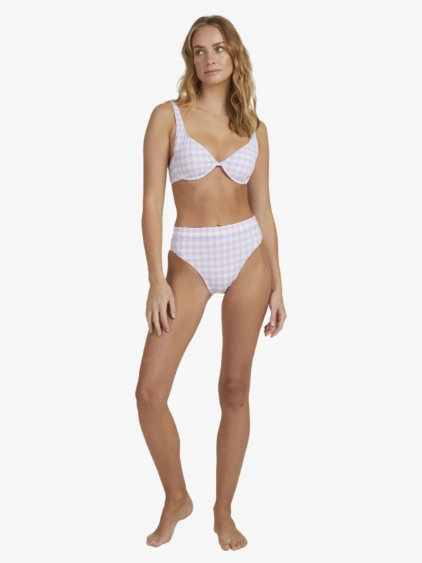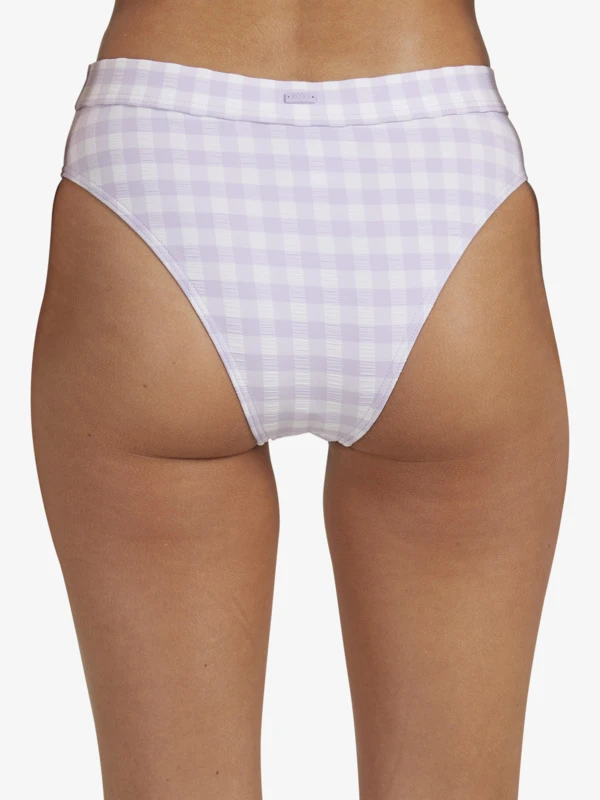 Made of textured swim fabric in a gingham checker print, this mid-rise bikini bottom has a not-too-skimpy, but not-too-full perfectly balanced bum cut.